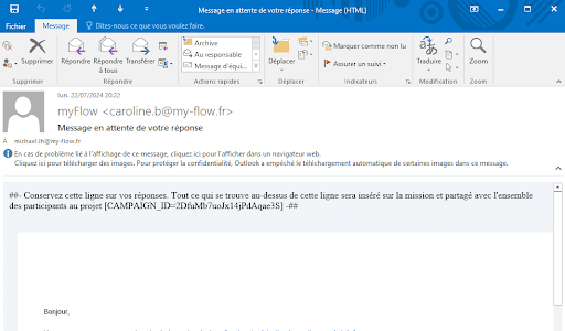 Lorsque cette phrase ci-dessous est présentée dans un email que vous recevez, répondez directement par email et le contenu de votre message sera centralisé sur myFlow et partagé à tous les intervenants.