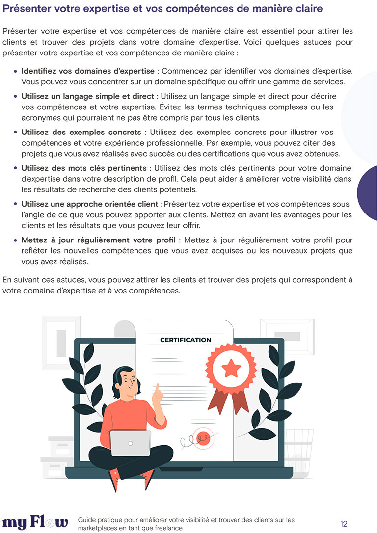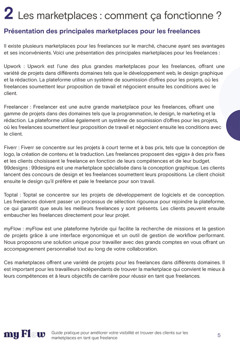 Notre livre blanc est le résultat d’une recherche approfondie et de l’expérience de nos experts en freelance. Il est conçu pour vous fournir les informations les plus pertinentes et les meilleures pratiques pour réussir en tant que freelance sur les marketplaces.