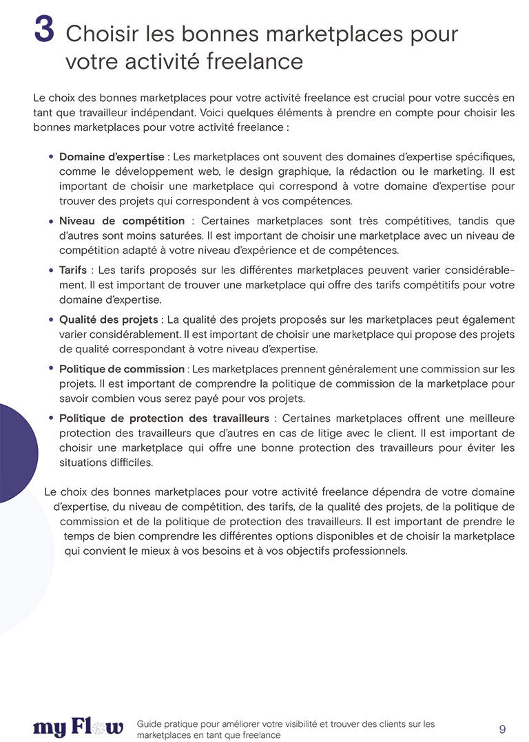 Notre livre blanc “Guide pratique pour améliorer votre visibilité et trouver des clients sur les marketplaces en tant que freelance” est une ressource essentielle pour les freelances qui cherchent à se démarquer sur ces plateformes. Téléchargez gratuitement notre guide pratique pour découvrir des conseils et des stratégies pratiques pour améliorer votre profil, fixer des tarifs compétitifs, améliorer votre communication avec les clients et gérer efficacement votre temps.