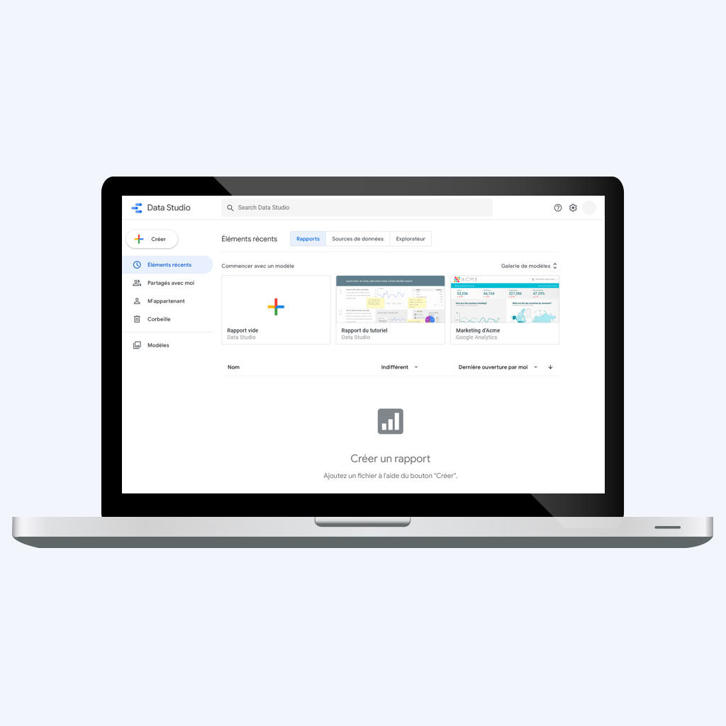 Pour cela, vous devez vous connecter à votre compte Google Data Studio. Une fois cela fait, le menu de gauche vous donnera accès à toutes les applications qui vous permettront de créer un reporting.